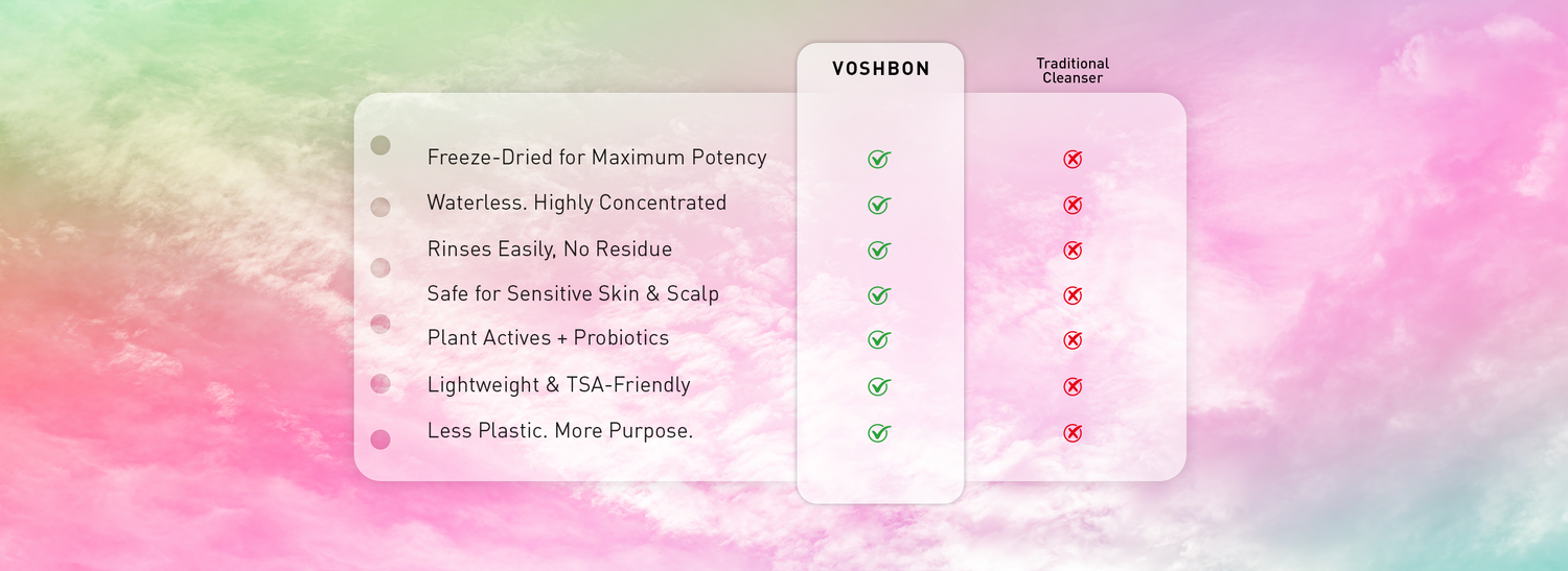 Yes. The freeze-dried, water-free format is leak-proof, TSA-compliant, and stable across temperatures. 75g of Voshbon equals 750ml of traditional liquid products, making it perfect for carry-on luggage, business trips, or camping.